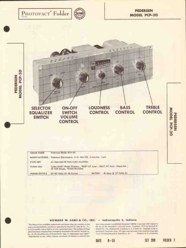 Vintage PEDERSEN model PCP-20 6 tube 20 watt audio amplifier. Original old Sams Photofact manual includes schematics, layouts, voltage & resistance readings, parts list. 4 pages. Dated 1955. Pedersen Electronics of Lafayette, CA.