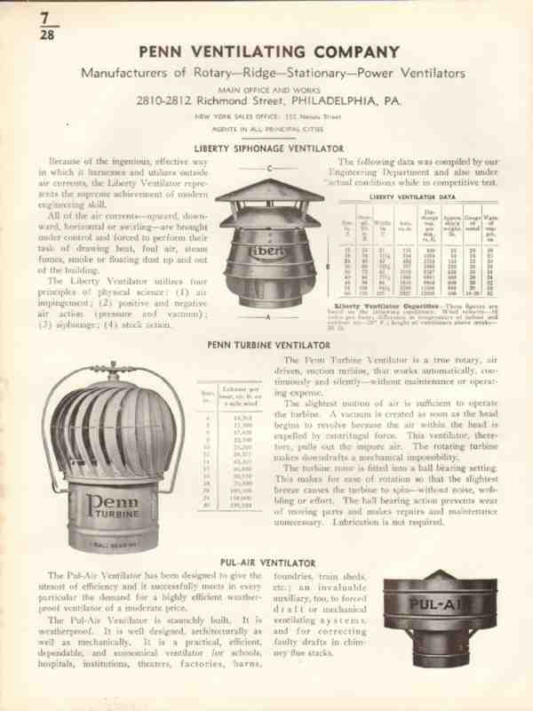 Original heating trade vintage catalog for PENN VENTILATING COMPANY. Main office and works was located at 2810-2812 Richmond Street, Philadelphia, PA.  Manufacturers of Rotary, Ridge, Stationary, Power Ventilators.  Products include Liberty Siphonage Ventilators, Turbine and Pul-Air Ventilators. Unbound from a large 1938 architectural catalog, this unique old two page technical specifications brochure would display beautifully matted and framed. Nice graphics. A marvelous addition to your retro ventilation equipment library. Pages are detached and contain a small amount of residual glue on edge.