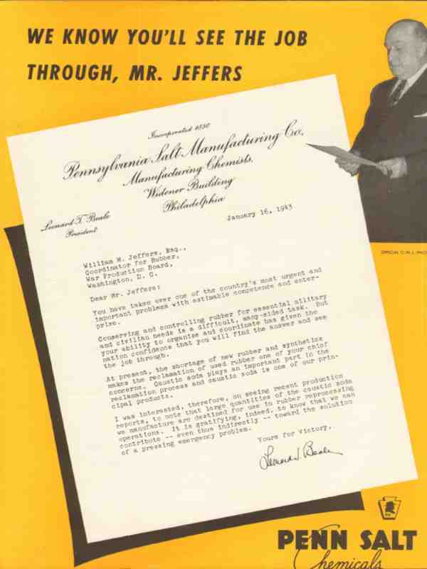 Original World War 2 caustic soda rubber industry trade magazine vintage ad for PENNSYLVANIA SALT MANUFACTURING COMPANY of Philadelphia, PA. Letter to Mr William Jeffers, Coordinator for Rubber from Leonard Beale, President of Penn Salt Chemicals. Old 1943 dated WW2 wartime era propaganda magazine advertisement.