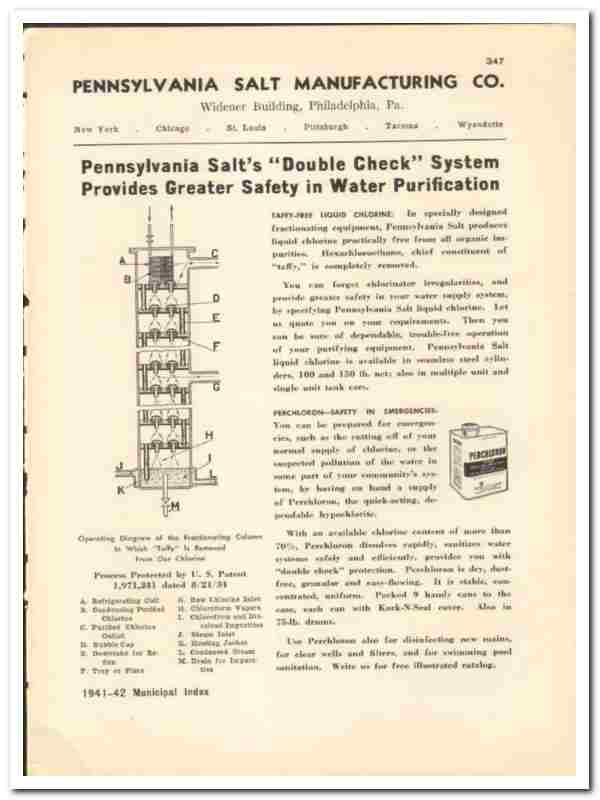 In specially designed fractionating equipment, Pennsylvania Salt produces liquid chlorine practically free from all organic impurities. Hexachloroethane, chief constituent of 'taffy', is completely removed. You can forget chlorinator irregularities, and provide greater safety in your water supply systems, by specifying Pennsylvania Salt Liquid Chlorine.