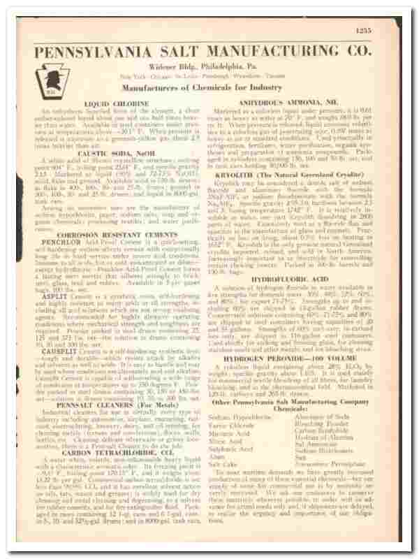 Products include Liquid Chlorine, Caustic Soda, Corrosion Resistant Cements, Penchlor, Asplit, Causplit, Pennsalt Cleaners, Carbon Tetrachloride, Anhydrous Ammonia, Kryolith, Hydrofluoric Acid and Hydrogen Peroxide., all are fully featured.