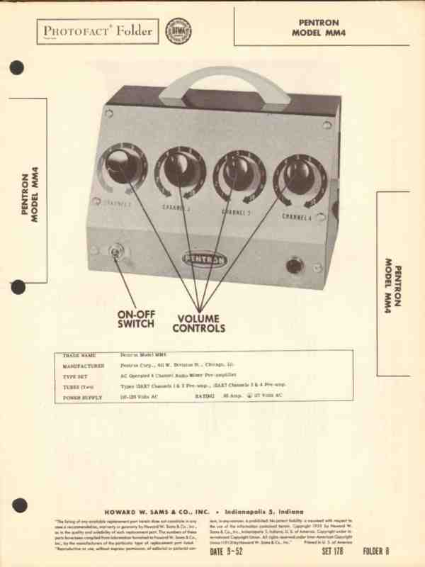 Vintage PENTRON model MM4 4 channel audio mixer pre-amplifier. Original old Sams Photofact manual includes schematic, layout, voltage & resistance test chart, repair parts list. 4 pages. Dated 1952. Pentron Corp., of Chicago, IL. This manual would make a sensational accompaniment to your classic audio equipment.