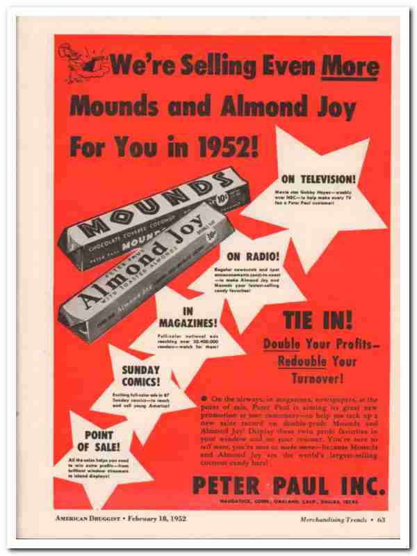 peter paul inc 1952 selling more mounds almond joy candy vintage ad