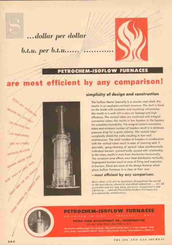 Original oil and gas trade magazine vintage ad for PETRO-CHEM DEVELOPMENT COMPANY, was located at 122 East 42nd Street. New York City, NY. Most efficient furnaces by any comparison. Better heat distribution, maximum fuel efficiency, low maintenance, zero air leakage, explosion resistant, plenum chambers for hazardous areas. This unique 1953 old one-page petroleum refining industry equipment magazine advertisement would display beautifully matted and framed.