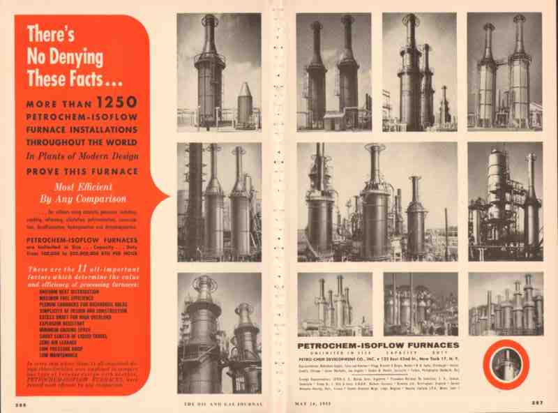 Original oil and gas trade magazine vintage ad for PETRO-CHEM DEVELOPMENT COMPANY, INC, of New York City, NY. No denying the facts, over 1250 Petrochem Isoflow furnace installations throughout the world. For refiners using catalytic process including cracking, reforming, alkylation, polymerization, desulfurization, dydrogenation and dehydrogenation. This unique 1955 two-page gatefold old petroleum refinery industry equipment magazine advertisement would display beautifully matted and framed.