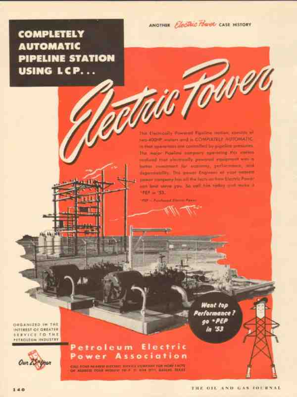 Original oil and gas trade magazine vintage ad for PETROLEUM ELECTRIC POWER ASSOCIATION of Dallas, TX.  Completely Automatic Pipeline Station Using LCP Electric Power consists of two 400 HP motors. Unique 1953 old petroleum oilfield industry magazine advertisement.