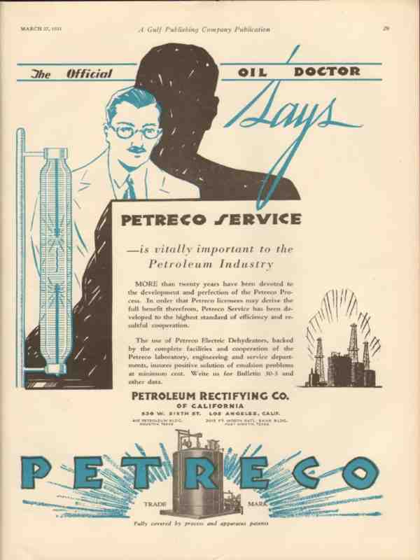 Original oil and gas trade magazine vintage ad for PETROLEUM RECTIFYING COMPANY of Los Angeles, CA. Petreco Service is Vitally Important to the Petroleum Industry. This unique 1931 old petroleum oilfield and refining equipment magazine advertisement would display beautifully matted and framed.