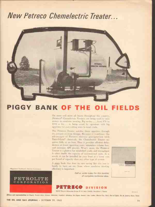 Original oil and gas trade magazine vintage ad for PETROLITE CORPORATION of Houston, TX.  Petreco Division. New Petreco Chemelectric Treater, Piggy Bank of the Oil Fields.  Used to save money in emulsion treating.  This unique 1962 old petroleum oilfield equipment industry magazine advertisement would display beautifully matted and framed.