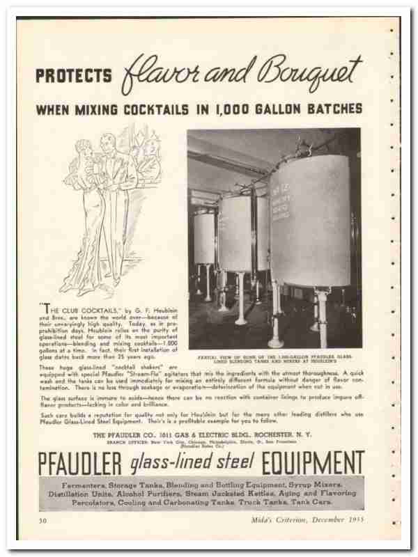 "The Club Cocktails," by G.F. Heublein and Bros, are known the world over, because of their unvaryingly high quality. Today, as in pre-prohibition days, Heublein relies on the purity of glass-lined steel for some of its most important operations ,blending and mixing cocktails, 1,000 gallons at a time. In fact, their first installation of glass dates back more than 25 years ago. These huge glass-lined cocktail shakers are equipped with special Pfaudler "Stream-Flo" agitators that mix the ingredients with the utmost thoroughness. A quick wash and the tents can be used immediately for mixing an entirely different formula without the danger of flavor contamination. There is no loss through soakage or evaporation, deterioration of equipment when not in use..