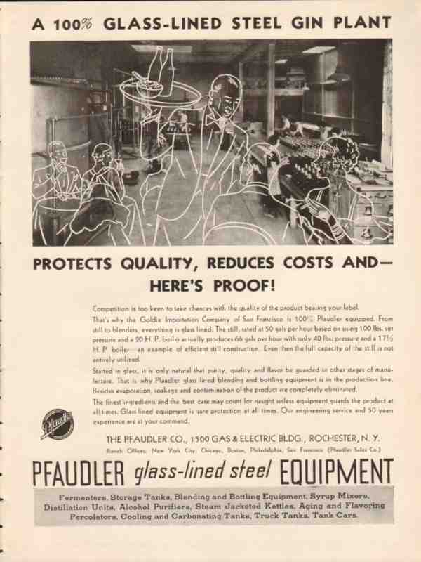 Original vintage whiskey, wine and spirits trade magazine ad for PFAUDLER COMPANY of Rochester, NY. The Goldie Importation company of San Francisco is 100 percent Pfaulder equipped. A Glass-Lined Steel Gin Plant Protects Quality, Reduces Costs. Old 1935 post Prohibition era advertisement.
