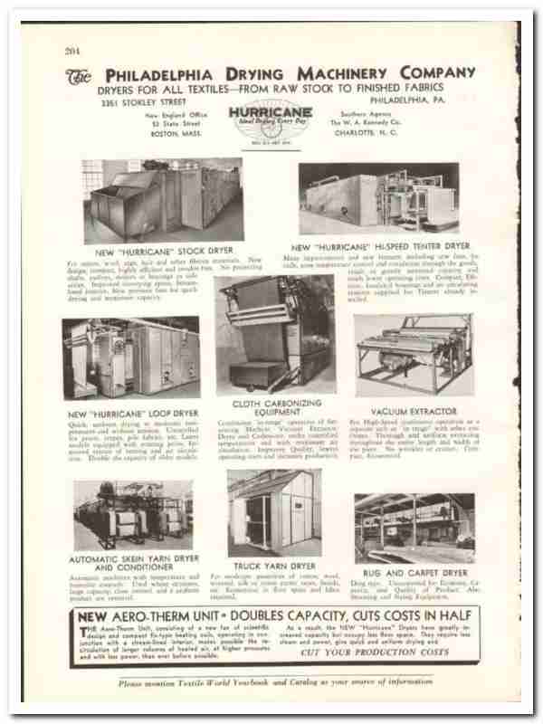Original 1938 textile trade vintage ad for PHILADELPHIA DRYING MACHINERY COMPANY. Main office and plant was located at 3351 Stokley Street, Philadelphia, PA.