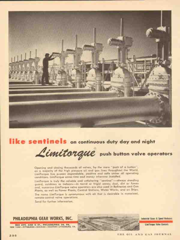 Original oil and gas trade magazine vintage ad for PHILADELPHIA GEAR WORKS, INC. of Philadelphia, PA. Like Sentinels on Continuous Duty Day and Night Limitorque Push Button Valve Operators. Used on high pressure oil and gas lines throughout the World. Unique 1953 old petroleum oilfield pipeline equipment industry magazine advertisement.