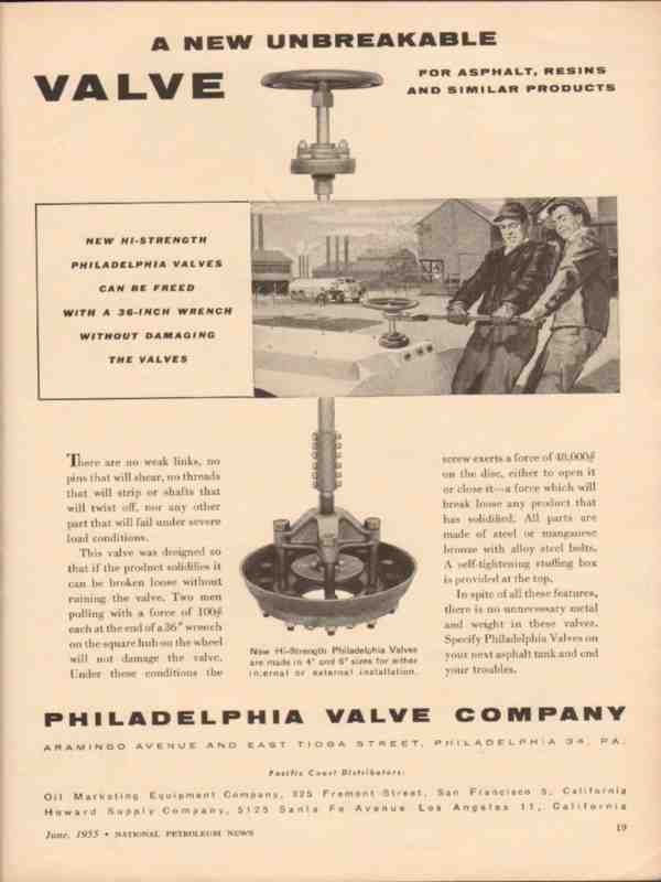 Original oil and gas petroleum pipeline industry trade magazine vintage ad for PHILADELPHIA VALVE COMPANY of Philadelphia, PA. A New Unbreakable Valve for Asphalt, Resins and Similar Products. Old 1955 gasoline pipe line advertisement.