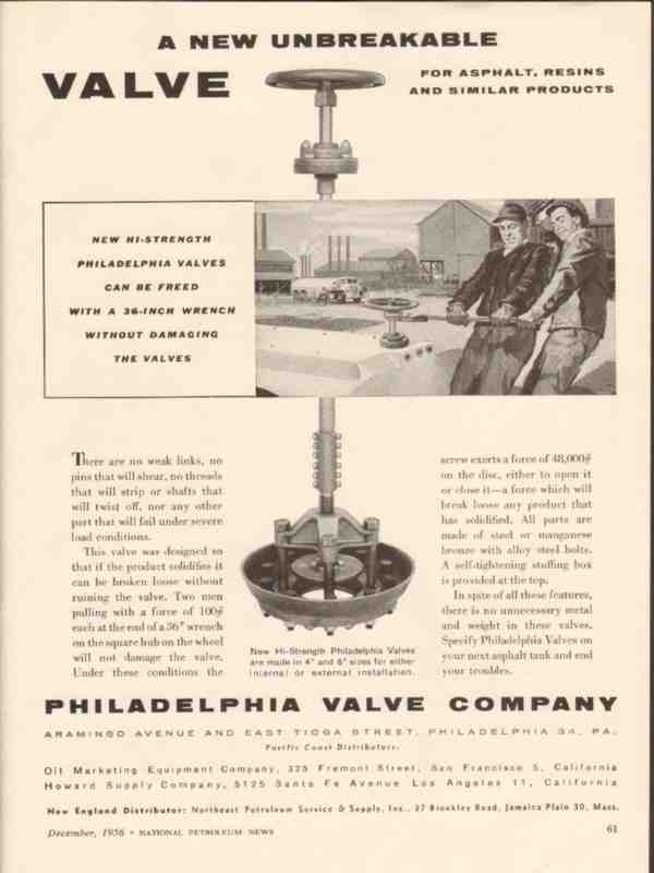 Original oil and gas trade magazine vintage ad for PHILADELPHIA VALVE COMPANY of Philadelphia, PA. Unbreakable Valves for Asphalt, Resins and Similar Products. This unique 1956 old petroleum oilfield pipeline valve equipment magazine advertisement would display beautifully matted and framed.