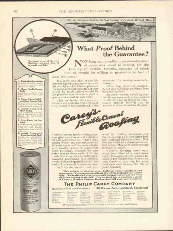 Original vintage architectural trade magazine ad for THE PHILIP CAREY COMPANY of Cincinnati, OH. What Proof Behind the Guarantee? Carey's Flexible Cement Roofing. Pictured is a 20 year old Carey Roof on St. Paul Foundry Company's plant in St. Paul, MN. Old 1912 construction industry advertisement.