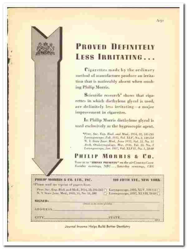 Cigarettes made by the ordinary method of manufacture produce an irritation that is noticeably absent when smoking Philip Morris. Scientific research shows that cigarettes in which diethylene glycol is used, are definitely less irritating, a major improvement in cigarettes. In Philip Morris, diethylene glycol is used exclusively as the hydroscopic agent.