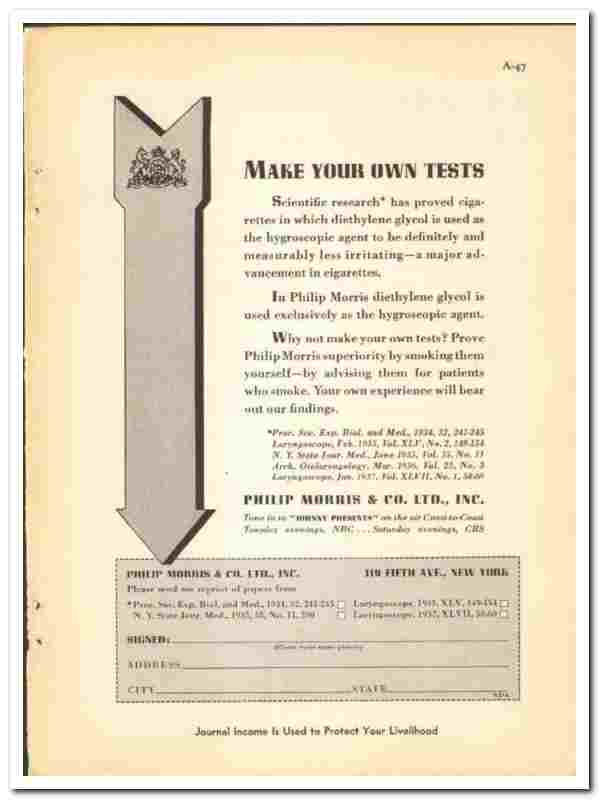 Scientific research has proved cigarettes in which diethylene glycol is used as hydroscopic agent to be definitely and measurably less irritating, a major advancement in cigarettes. In Phillip Morris, diethylene glycol is used exclusively as the hydroscopic agent. Why not make your own tests? Prove Philip Morris superiority by smoking them yourself, by advising them for patients who smoke. Your own experience will hear out our findings.