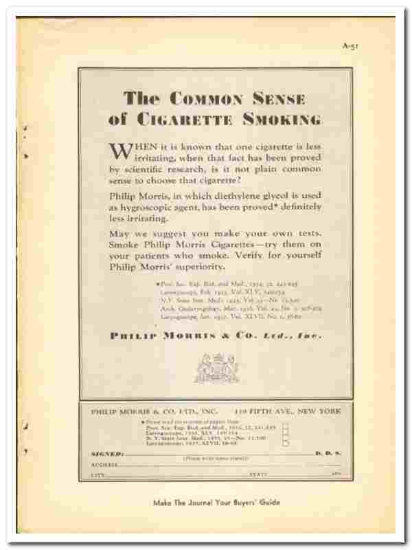 When it is known that one cigarette is less irritating, when that fact has been proved by scientific research, is it not plain common sense to choose that cigarette? Philip Morris, in which diethylene glycol is used as hydroscopic agent, has been proved definitely less irritating. May we suggest you make your own tests. Smoke Phillip Morris cigarettes, try them on your patients who smoke. Verify for yourself Philip Morris's superiority.