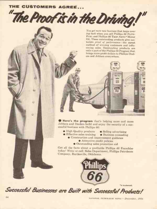 Original old retail service station trade magazine vintage ad for PHILLIPS PETROLEUM COMPANY of Bartlesville, OK. Proof of Performance with 66 Flite-Fuel and Top-Artic Motor Oil. This unique old 1956 gasoline advertisement would display beautifully matted and framed.