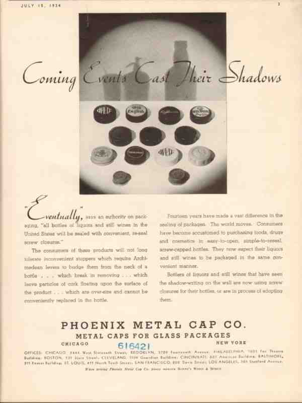 Original vintage whiskey, wine and spirits trade magazine ad for PHOENIX METAL CAP COMPANY of Chicago and New York City, NY. Coming Events Cast Their Shadows. Bottlers of liquors and still wines that have seen the shadow writing on the wall are now using screw closures for their bottles, or are in process of adopting them. Old 1934 dated rare Post Prohibition era bottling advertisement.
