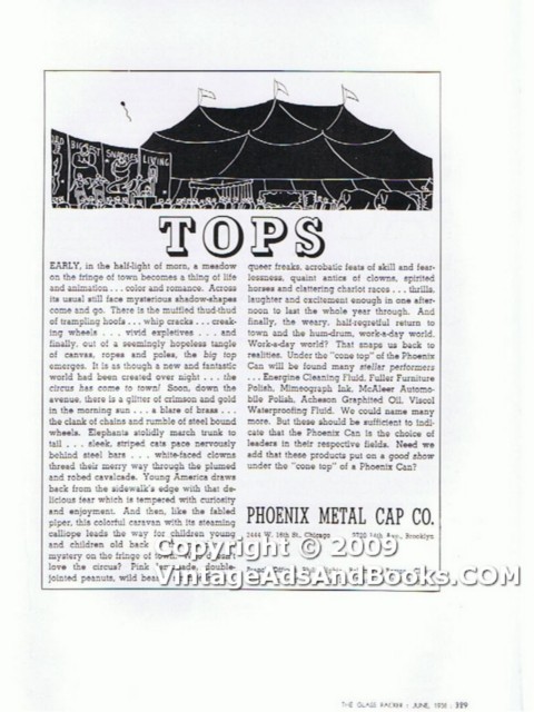 Original vintage magazine ad, PHOENIX METAL CAP COMPANY of Chicago, IL. and Brooklyn, NY. Who Doesn't love the circus? Pink lemonade, double-jointed peanuts, queer freaks, quaint antics of clowns ... thrills, laughter and excitement enough in one afternoon to last the whole year through. Under the cone top of the Phoenix Can will be found many stellar performers - Energine Cleaning Fluid, Fuller Furniture Polish, Mimeograph Ink, McAleer Automobile Polish, Acheson Graphited Oil, Viscol Waterproofing Fluid. Need we add that these products put on a good show under the cone top of a Phoenix Can? Old 1938 glass packer industry advertisement. Would look fantastic matted and framed.