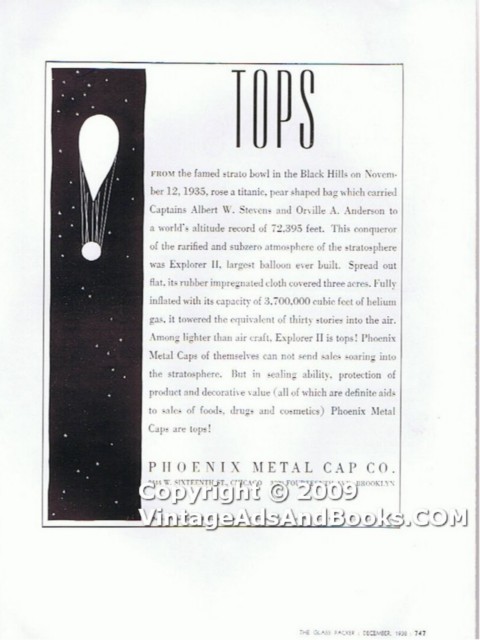 Original vintage magazine ad, PHOENIX METAL CAP CO. of Chicago, IL. and Brooklyn, NY. From the famed strato bowl in the Black Hills on November 12, 1935, rose a titanic, pear shaped bag which carried Captain Albert W. Stevens and Orville A, Anderson to a world's altitude record of 72,395 feet. This conqueror of the rarified and subzero atmosphere of the stratosphere was Explorer II, largest balloon ever built. Phoenix Metal Caps of themselves can not send sales soaring into the stratosphere. But in sealing ability, protection of product and decorative value Phoenix Metal Caps are tops! Old 1938 glass industry advertisement would look fantastic matted and framed.