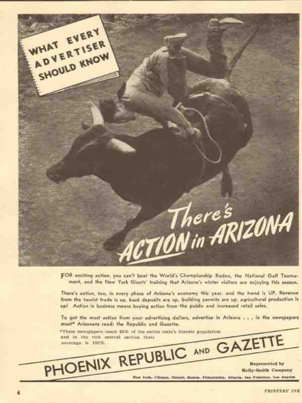 Original vintage advertising media trade magazine ad for PHOENIX REPUBLIC AND GAZETTE Newspapers. There's Action in Arizona! For exciting action, you can't beat the World's Championship Rodeo, National Golf Tournament, and the New York Giants' training. To get the most action from your advertising dollars, advertise in Arizona. Old 1947 advertising industry advertisement, would display beautifully matted and framed.