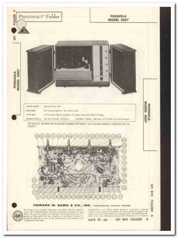 Vintage PHONOLA model 4007 AC operated 10 transistor stereo amplifier, with 4 speed automatic record changer. Original old Sams Photofact manual includes schematic, parts layouts, parts list and description. 4 pages. Dated 10-1966. Manufactured by Waters Conley Company, Inc., of Rochester, MN. This manual would make a sensational accompaniment to your retro phonograph equipment.