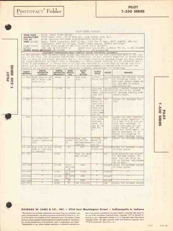 Vintage PILOT model T-530 8 tube multi-band Superheterodyne AM FM SW radio receiver. Original old Sams Photofact manual includes schematic, layout, alignment instructions, voltage & resistance test chart, repair parts list and description. 6 pages. Dated 1947. Pilot Radio Corporation of Long Island City, NY. This manual would make a sensational accompaniment to your classic radio equipment.