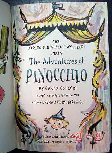 Hard covered book titled THE AROUND THE WORLD TREASURES ITALY THE ADVENTURES OF PINOCCHIO By Carlo Collodi, Pictures by Charles Mozley, 1959 1st Printing. 224 pages. The last page is detached. Pages are clean, dust jacket is torn and scuffed.