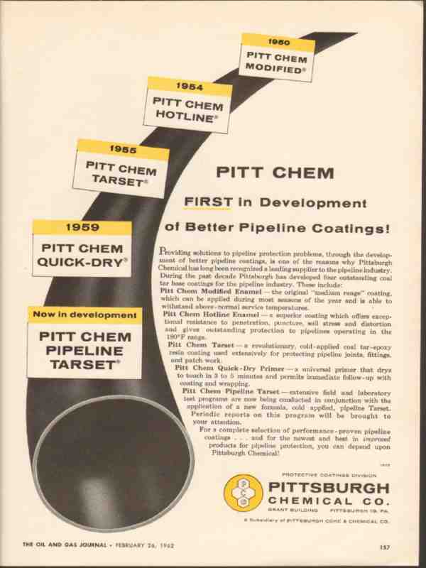 Original oil and gas trade magazine vintage ad for PITTSBURGH CHEMICAL COMPANY of Pittsburgh, PA. Pitt Chem, First in Development of Better Pipeline Coatings! Now in development, Pitt Chem Pipeline Tarset. Protective Coatings Division. This unique 1962 old petroleum oilfield pipe line equipment magazine advertisement would display beautifully matted and framed.