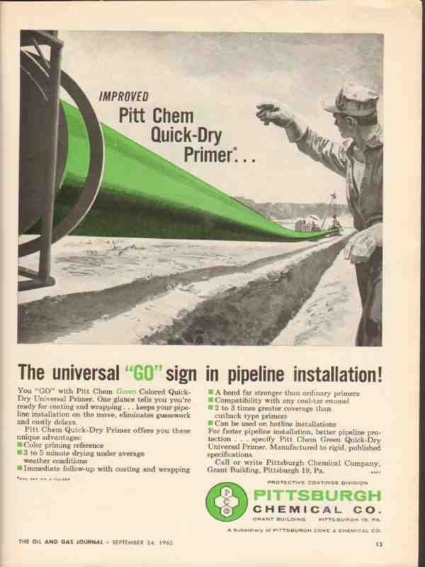 Original oil and gas trade magazine vintage ad for PITTSBURGH CHEMICAL COMPANY of Pittsburgh, PA. Improved Pitt Chem Quick Dry Primer, The Universal Go Sign in Pipeline Installation! This unique 1962 old petroleum oilfield pipe line equipment magazine advertisement would display beautifully matted and framed.