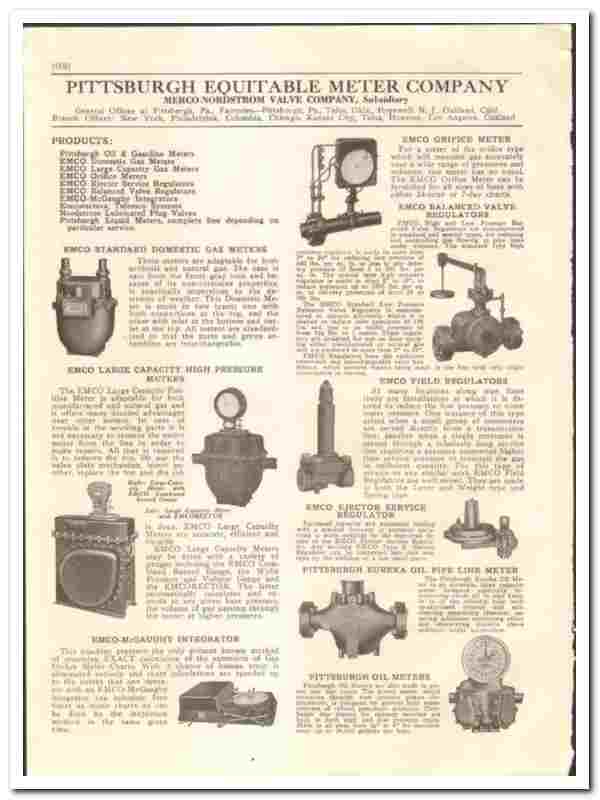 Products include the EMCO Standard Domestic Gas Meters, EMCO Large Capacity High Pressure Meters, EMCO - McGaughy Integrator, EMCO Orifice Meter, EMCO Balanced Valve Regulators, EMCO Field Regulators, EMCO Ejector Service Regulators, Pittsburgh Eureka Oil Pipe Line Meter and Pittsburgh Oil Meters, all are fully featured.