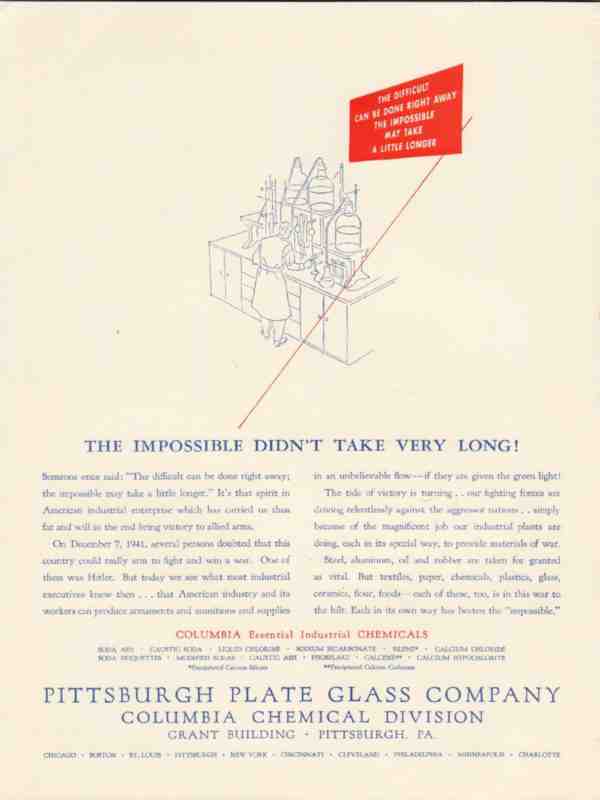 Original World War 2 chemical industry trade magazine vintage ad for PITTSBURGH PLATE GLASS COMPANY of Pittsburgh, PA. Columbia Chemical Division. The Impossible Didn't Take Very Long! American industry and its workers can produce armaments and munitions and supplies in an unbelievable flow. Old 1943 WW2 wartime era propaganda magazine advertisement.