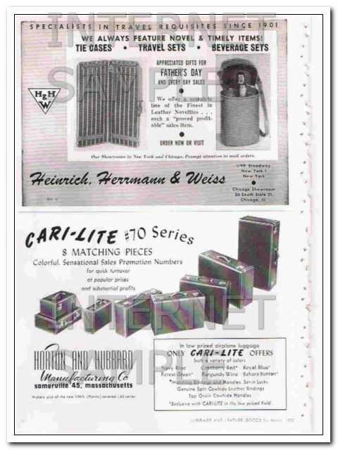 Original luggage trade magazine vintage ad for PLATT LUGGAGE, INC. Main office and plant was located in Chicago, IL. Manufacturers of luggage. Products include the Side-Kick, the Airess Drum, and Saratoga luggage for women are featured. This unique 1950 old luggage industry magazine advertisement would display wonderful matted and framed. Nice graphics. (Scan shows a slight pink tint that is not part of the actual ad). On the reverse side are fractional page ads for HEINRICH, HERRMANN & WEISS, of New York, NY. Tie Cases, Travel Sets, Beverage Sets., and an ad for the HORTON & HUBBARD MANUFACTURING COMPANY, of Somerville, MA. Cari-Lite #70 Series and Matching Pieces of Luggage. Old leather goods and luggage advertisements. Approximate size 9 x 11 inches.