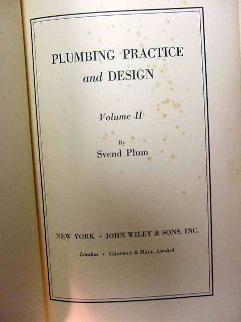 Hard covered book titled PLUMBING PRACTICE AND DESIGN by Svend Plum, 1943, Volume II.