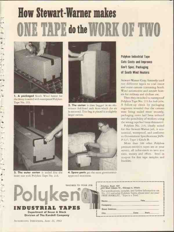 Original vintage automotive industries trade magazine ad for POLYKEN INDUSTRIAL TAPE of Chicago, IL. Division of The Kendall Company, Department of Bauer & Black. How Stewart-Warner Makes One Tape do the Work of Two. Polyken Industrial Tape Cuts Costs and Improves Government Spec.. Packaging of South Wind Heaters. Old 1953 industrial advertisement.