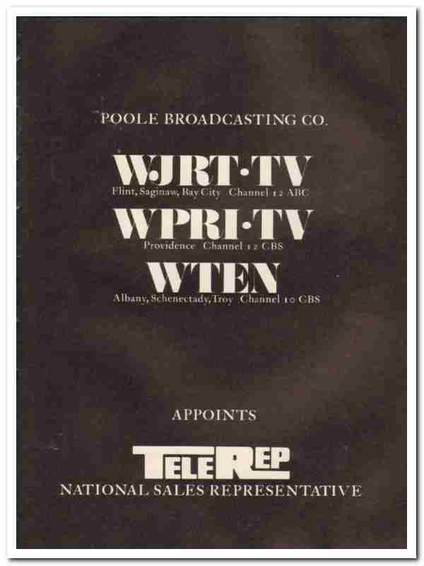 Original media vintage magazine ad for POOLE BROADCASTING COMPANY. WJRT-TV, WPRI-TV, WTEN Appoints Telerep National Sales Representative. Channel 12 in Flint, Saginaw, Bay City. Providence. Channel 10 in Albany, Schenectady and Troy.