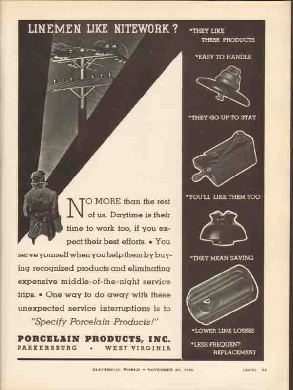 Original old electrical power line equipment industry trade magazine ad for PORCELAIN PRODUCTS, INC of Parkersburg, WV. Linemen Like Nitework? To do away with unexpected service interruption is to Specify Porcelain Products! This 1936 industry magazine advertisement would display beautifully matted and framed.