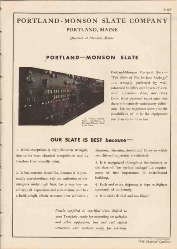 Original electrical trade vintage catalog for PORTLAND-MONSON SLATE COMPANY, was located in Portland, ME. Manufacturers of electrical panels and enclosures, preferred by builders and buyers alike. High dielectric strength, durability, recognized as the slate of no surface leakage. Disbound from a large 1948 electrical construction materials book, this unique old one page technical brochure would display wonderfully matted and framed. A marvelous addition to your retro electric equipment library.