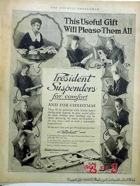 Original vintage magazine ad, PRESIDENT SUSPENDERS COMPANY of Shirley, MA. WW1 War Savings Stamps. Old 1918 men's clothing advertisement.