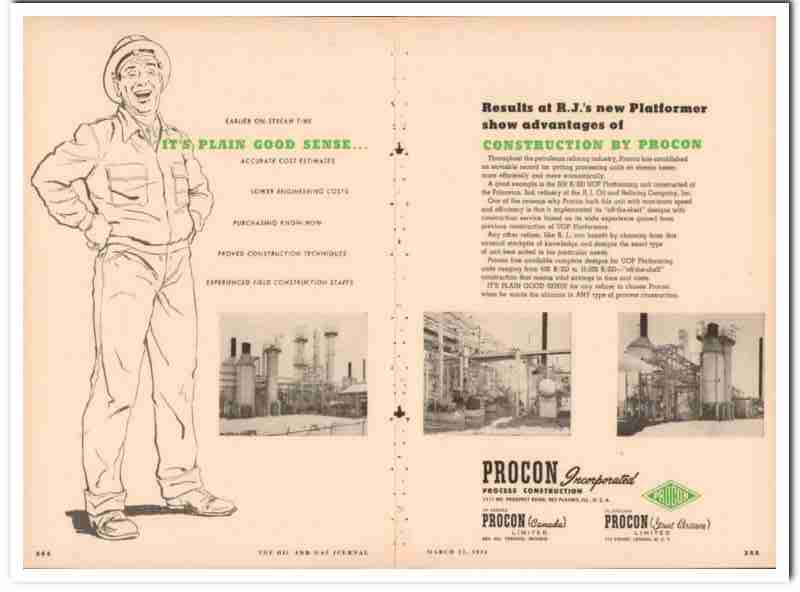 Original gas and oil trade magazine vintage ad for PROCON INCORPORATED. Main office and plant was located at 1111 Mt. Prospect Road, in Des Plaines, IL. Construction By Procon. A 600 B/SD UOP Platforming unit constructed at the Princeton, IN refinery of the R. J. Oil and Refining Company. This unique 1954 two-page gatefold old petroleum refining industry equipment magazine advertisement would display beautifully matted and framed.