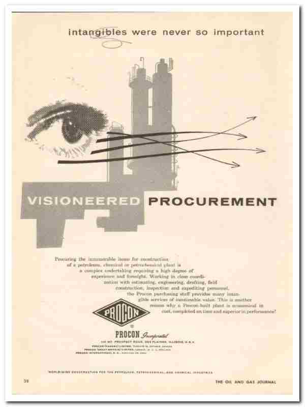 Original oil and gas trade magazine vintage ad for PROCON INCORPORATED.  Main office was located at 1111 Mt. Prospect Road, Des Plaines, IL. Visioneered Procurement for construction of petrochemical or chemical plant is a complex undertaking requiring a high degree of experience and foresight. Working in close coordination with estimating, engineering, drafting, field construction, inspection and expediting personnel, the purchasing staff provides many intangible services of inestimable value. This unique old 1959 one-page petroleum oilfield and refining process industry equipment magazine advertisement would display beautifully matted and framed.