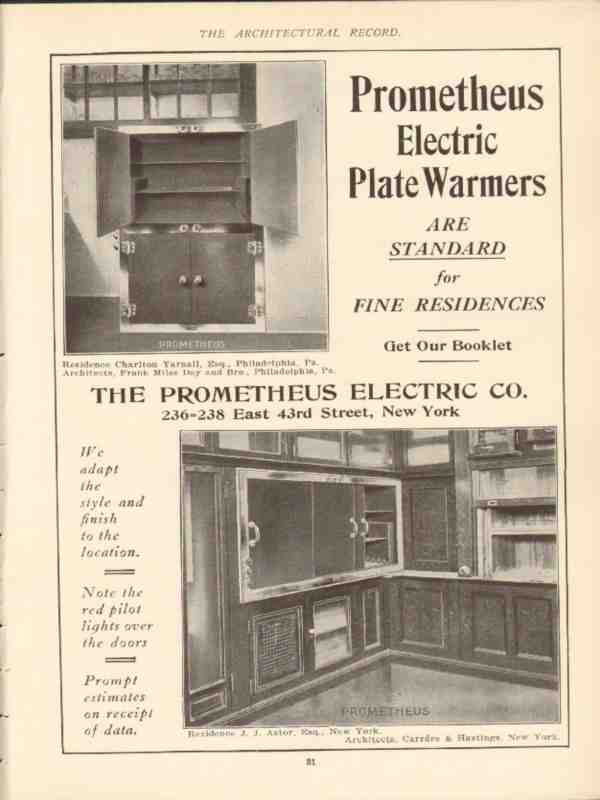 Original vintage architectural trade magazine ad for THE PROMETHEUS ELECTRIC COMPANY of New York City, NY. Prometheus Electric Plate Warmers are Standard for Fine Residences. Residence Charlton Yarnall, Esquire of Philadelphia, PA. Architects, Frank Miles Day and Brother. Residence J.J. Astor, Esquire, of New York City. Architects Carre and Hastings. Old 1910 interior design advertisement.