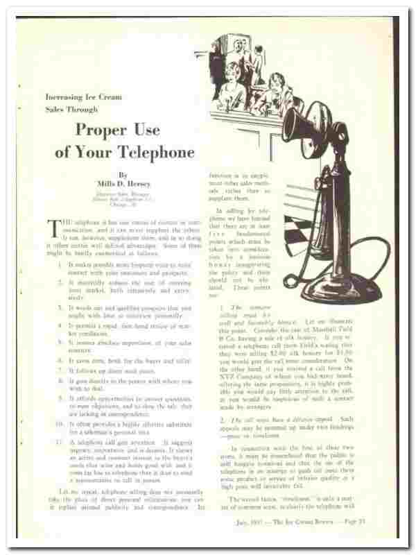 Original 1937 dairy vintage magazine article titled 'Increasing Ice Cream Sales Through Proper Use of Your Telephone', written by Mills D. Hersey, Division Sales Manager of Illinois Bell Telephone Company, Chicago, IL.