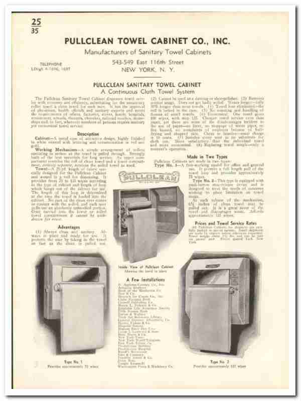 Original bathroom trade vintage catalog for PULLCLEAN TOWEL CABINET COMPANY, INC. Main office and plant was located at 543-549 East 116th Street, New York City, NY.