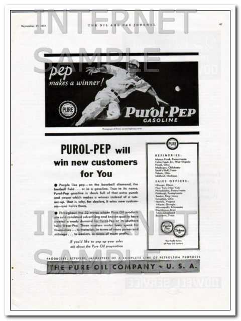Original oil and gas trade magazine vintage ad for THE PURE OIL COMPANY, U.S.A. Pep Makes a Winner! Purol-Pep Gasoline. People like pep - on the baseball diamond, the football field, or in a gasoline. Producers, Refiners, Marketers of a Complete Line of Petroleum Products. Shows photograph of the 'current' (1934) highway poster. Unique 1934 old petroleum products refining process industry magazine advertisement. Approximate size 10 x 13 inches.