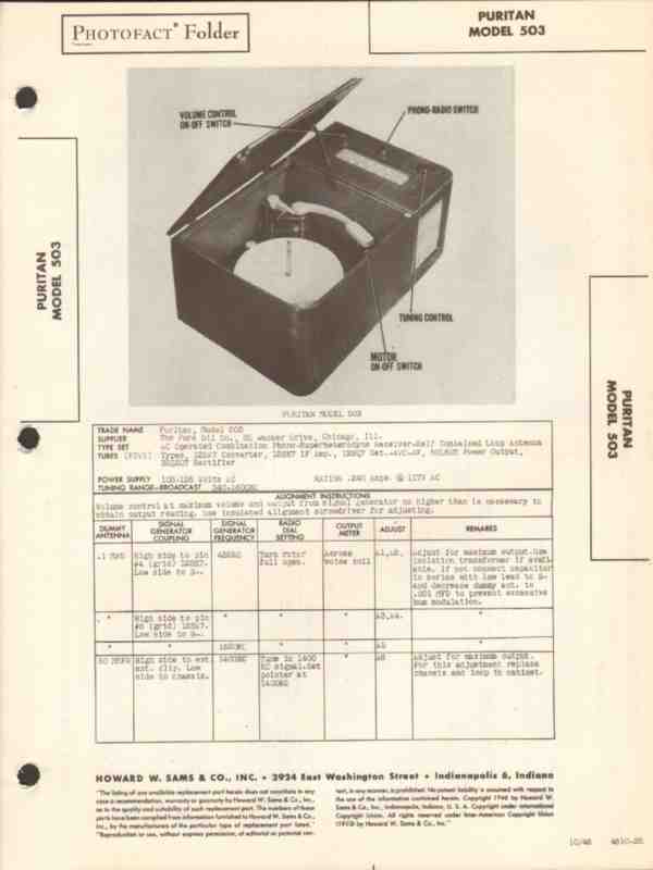 Vintage PURITAN model 503 combination Superheterodyne 5 tube AM radio receiver with phonograph record player changer. Original old Sams Photofact manual includes schematic, layout, alignment instructions, voltage & resistance test charts, repair parts list and description. Dated 1946. 4 pages. Pure Oil Co., of Chicago, IL.