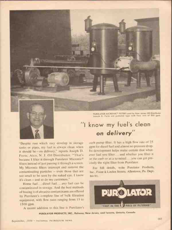 Original oil and gas trade magazine vintage ad for PUROLATOR PRODUCTS, INC of Allentown, PA. Joseph D. Forte, Atco, New Jersey Oil Distributor. Micronic filters intercept and remove contaminating particles. My fuel's clean on delivery. This unique old 1956 retail petroleum products service station equipment magazine advertisement would display beautifully matted and framed.