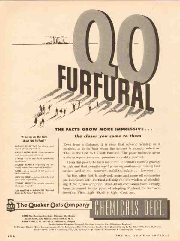 Original vintage oil and gas trade magazine ad for THE QUAKER OATS COMPANY of Chicago, IL. Chemicals Department. QO Furfural, The Facts Grow More Impressive the Closer You Come to Them. Solvent Refining. Old 1954 petroleum industry oilfield and refinery advertisement.